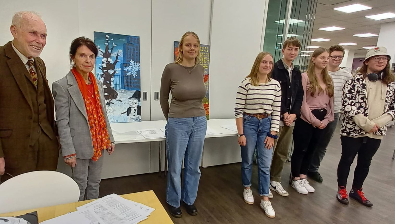 Besonders erfreulich war, dass die Oberstufenlehrkräfte Elke Baeutsch, Andreas Schulz und Dr. Natascha Hoefer mit Erfolg aktive Teilnehmer in der Schülerschaft gefunden hatten, die als Lesende im Wechsel mit dem Leseteam der DFG (Josiane Hoefer-Lézénès und Ingolf Hoefer, die natürlich einen professionellen Vorsprung hatten) hochkarätige Lyrik vortrugen: von der Goethe-Schule waren das Luisa Keiner, Lea Weimer, Alexander Laturnus, Hannah-Eileen Schulz und Jonathan Brattig. Gio Troncone aus der Jahrgangsstufe 12 der Theodor-Heuß-Schule hatte dazu zwei durch Farbkraft und Stimmung starke großformatige Leinwandbilder als Raumschmuck hergestellt.